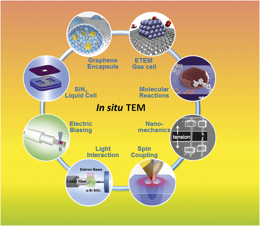 We focus on in situ multimodal characterization (e.g., TEM and SEM) to study solid-liquid interfaces. A collection of techniques including transmission electron microscopy, nanofabrication, nanomaterials synthesis and engineering, and theoretical computation through collaboration are used.