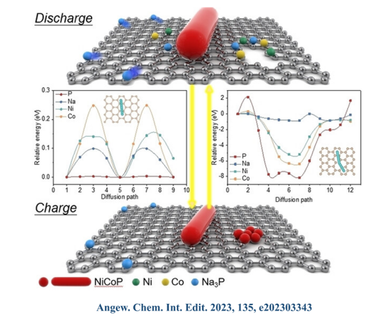 有鉴于此,研究团队以过渡金属化合物NiCoP@C为研究对象,采用原位透射电镜(in situ TEM)、XANES和原位XRD等表征手段,揭示了影响过渡金属化合物负极的CE和循环性能的本质原因是化合物中不同原子迁移能力的差异和放电产物的空间分布。DFT理论计算结果说明材料组分不同原子迁移能力的差异的本质原因以及无席碳对活性材料的稳定效应。发现无序碳对活性组分的锚定效果远大于对Nat的作用。这一机理的发现为进一步通过调控NiCoP@C电极中的无席碳实现对电池初始库伦效率以及循环性能的改善提供了指导。这一概念为理解构效关系和性能改进策略背后的本质原因提供了新的见解