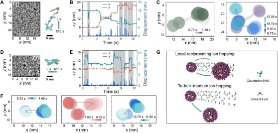 鉴于此,研究团队选择多金属氧酸盐(POMs)溶液为液相离子模型体系,使用团队发展的超薄液体池芯片原位透射电镜技术,在单离子尺度上实时可视化追踪研究了离子扩散及离子间相互作用。球差校正TEM清晰捕捉了水中POM离子{Mo132}结构细节,高分辨TEM模拟进一步确认了实验结果。高时间分辨追踪了单离子扩散动态,发现了离子独特的往复跳跃运动 (ion hopping),可能是反荷离子和水分子在局部区域形成的短程有序结构所导致。定量分析了离子间可逆配对过程,确认了其主要驱动力为反荷离子介导吸引作用。发现溶液中离子的小聚集体普遍存在,且这些聚集体进行着持续的构型转变,其形成和构型转变受离子结构影响。该研究工作为溶液中离子动态研究提供了新的见解。