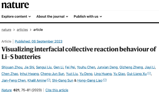 北京时间9月6日23时,厦门大学化学化工学院廖洪钢教授、孙世刚院士团队,与北京化工大学陈建峰院士团队和美国阿贡国家实验室徐桂良、Khalil Amine研究员团队合作,在国际顶级期刊Nature上发表了题为“Visualizing Interfacial Collective Reaction Behaviour of Li-S Batteries”的最新研究成果。该项成果基于自主研发建立的高时空分辨电化学原位液相透射电子显微系统(EC-TEM),对锂硫电池界面反应过程进行了深入研究,首次发现了锂硫电池电荷储存聚集反应新机制。