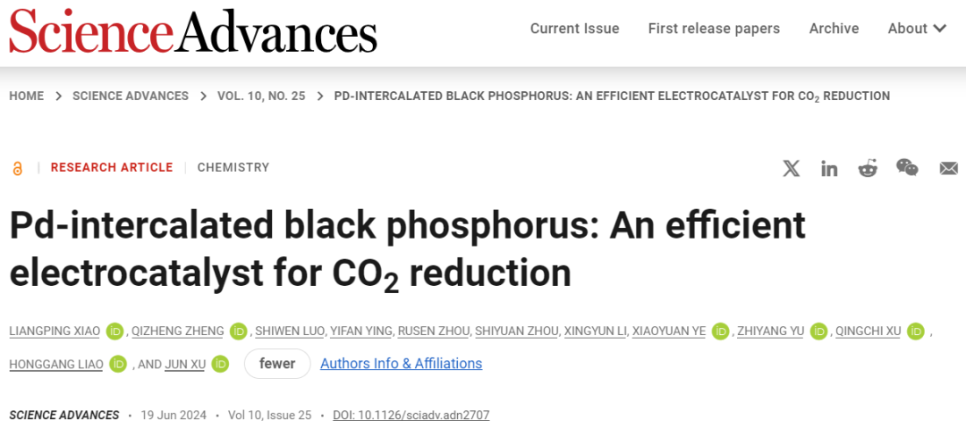 2024年6月19日,Sci. Adv.在线发表了厦门大学徐俊教授、廖洪钢教授和许清池副教授课题组的研究论文,题目为《Pd-intercalated black phosphorus: An efficient electrocatalyst for CO2 reduction》,论文的第一作者为Liangping Xiao和Qizheng Zheng。