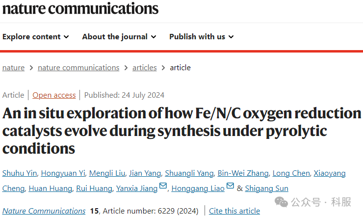 2024年7月24日,厦门大学孙世刚院士、廖洪钢教授、姜艳霞教授团队在Nature Communications期刊发表题为“An in situ exploration of how Fe/N/C oxygen reduction catalysts evolve during synthesis under pyrolytic conditions”的研究论文,厦门大学博士生殷述虎为论文第一作者,姜艳霞教授、廖洪钢教授为论文共同通讯作者。