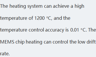 l The heating system can achieve a high temperature of 1200 °C. The system uses a feedback temperature control mode, ensuring a temperature control accuracy of 0.01°C. The MEMS chip heating technology enables precise control and reduces drift rates.